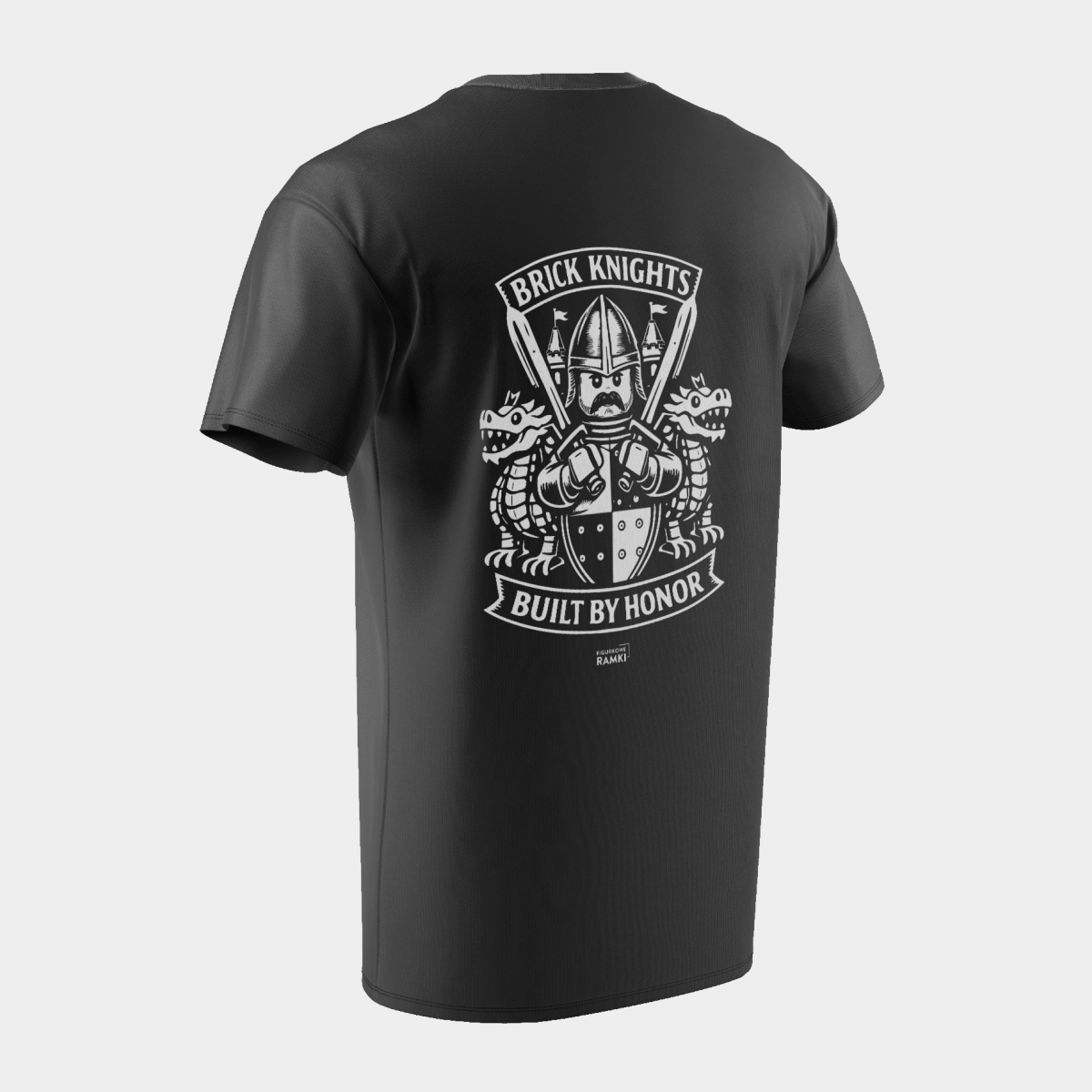 Koszulka Brick Knights (czyli „klockowi rycerze”) to propozycja dla fanów budowania z klocków LEGO, którzy lubią klimat średniowiecznych legend, zamków i smoków. Grafika inspirowana jest heraldyką rycerską – w centrum znajduje się minifigurka rycerza z mieczami i tarczą, otoczona smokami oraz elementami przypominającymi zamkowe wieże.