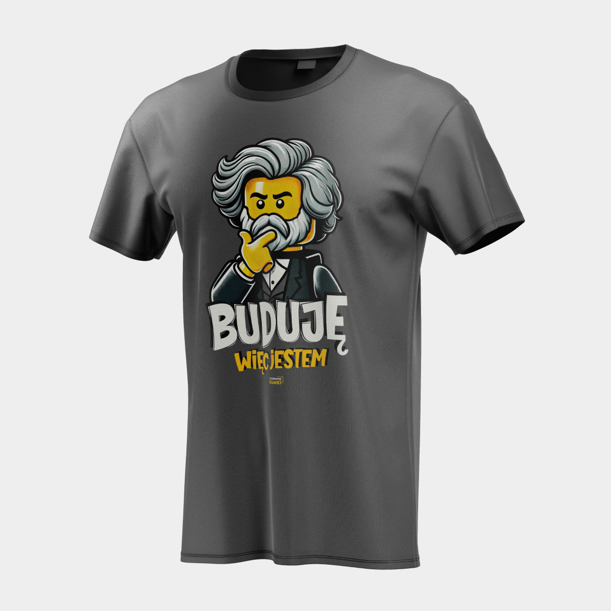 Materiał dla koszulek dziecięcych: 60% bawełna/40% poliester, gramatura 150 g/m² - Nadruk: Filozof – minifigurka LEGO + hasło „Buduję, więc jestem”