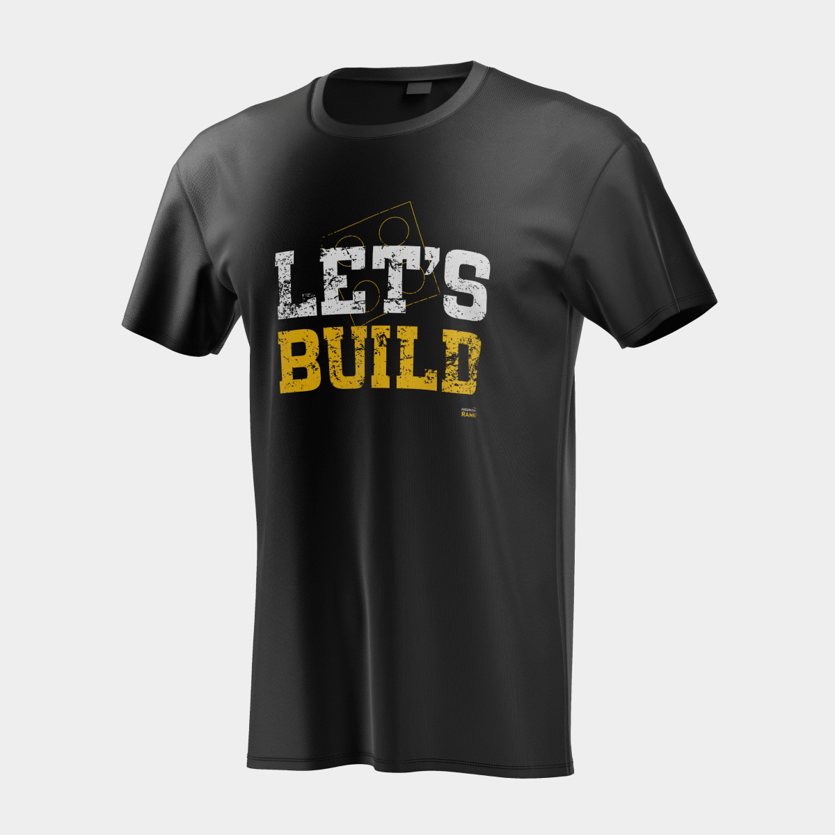 Materiał dla koszulek dziecięcych: 100% bawełna, gramatura 150 g/m² - Nadruk: Biało-żółty stylizowany napis „Let’s build”