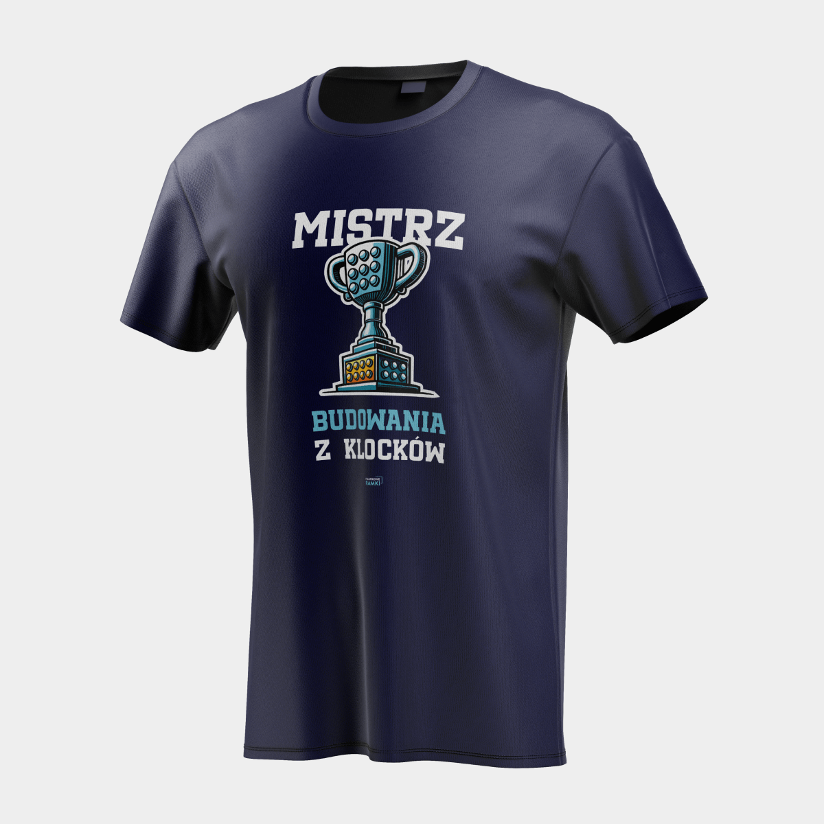 Koszulka w kolorze French Navy (granatowy) prezentuje efektowny nadruk w barwach biało-błękitno-żółtych. W centrum znajduje się puchar zbudowany z klocków LEGO, z wyraźnymi pinami, a nad nim duży napis „Mistrz”. Całość dopełnia podkreślający pasję dopisek „budowania z klocków”. To doskonały sposób, by z dumą pokazać swoją miłość do konstrukcji!