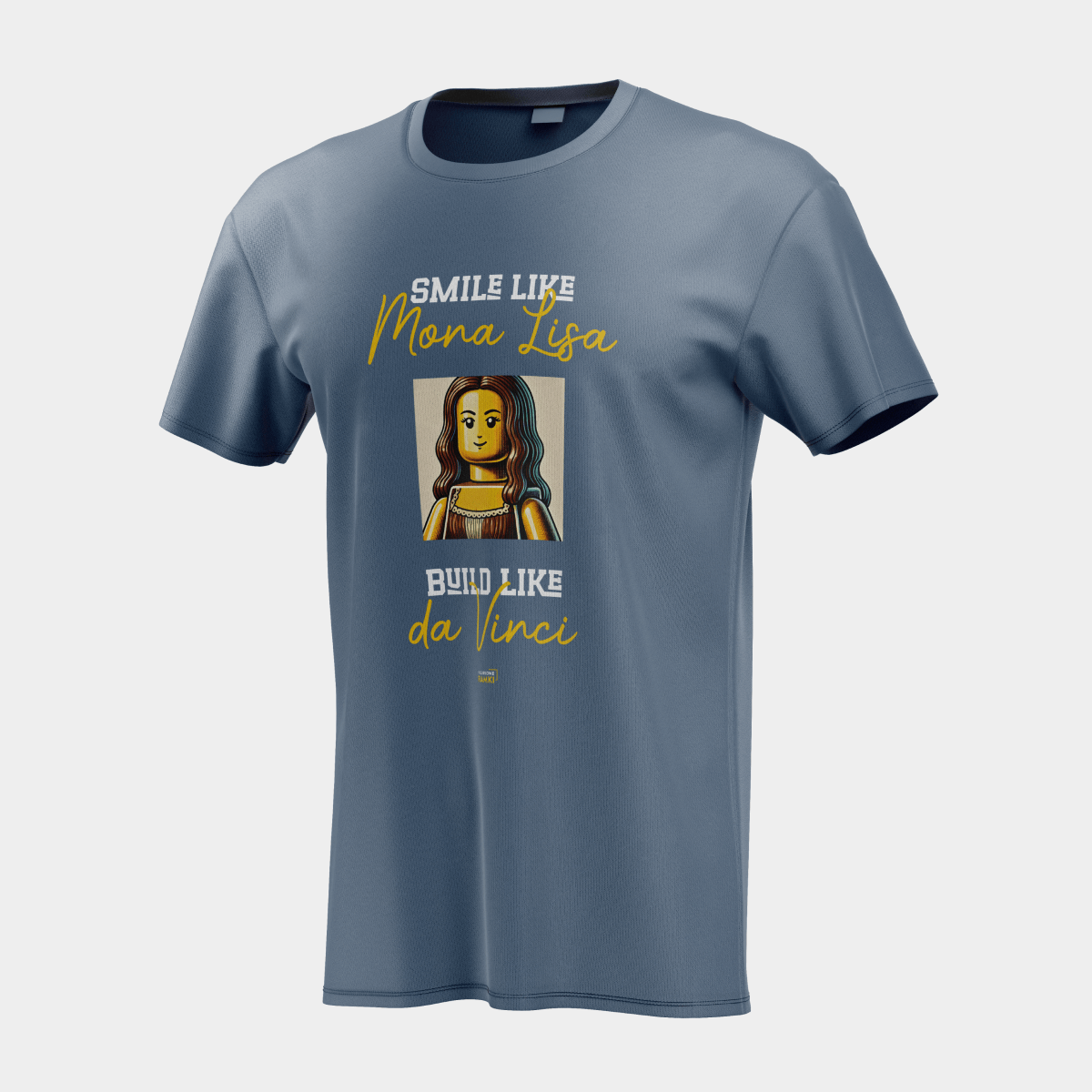 Koszulka w kolorze Denim (niebieskoszary) wyróżnia się unikalnym nadrukiem – w centrum znajduje się Mona Lisa w wersji minifigurki z klocków LEGO, a wokół niej napis w kolorach białym i żółtym: „Smile like Mona Lisa, build like da Vinci”. To hołd dla mistrza wynalazków i wszystkich, którzy wierzą, że kreatywność nie zna granic!