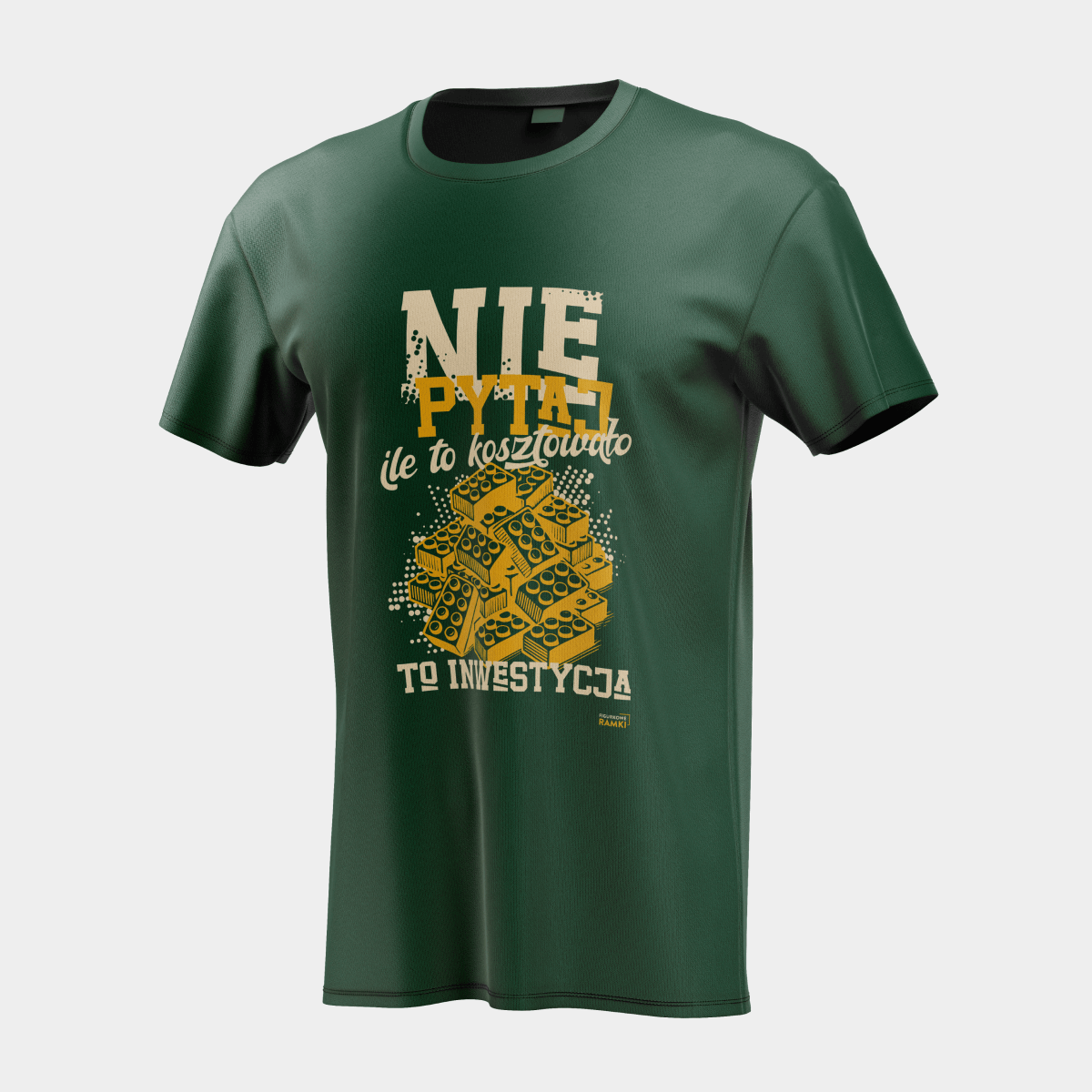 Koszulka w kolorze Bottle Green (butelkowa zieleń) wyróżnia się biało-żółtym napisem „Nie pytaj, ile to kosztowało”, a pod nim ilustracją klocków LEGO oraz dopiskiem „to inwestycja”. Subtelne, ale wyraziste połączenie sprawia, że koszulka wygląda świetnie i pasuje zarówno na codzienne wyjścia, jak i spotkania z innymi fanami LEGO.
