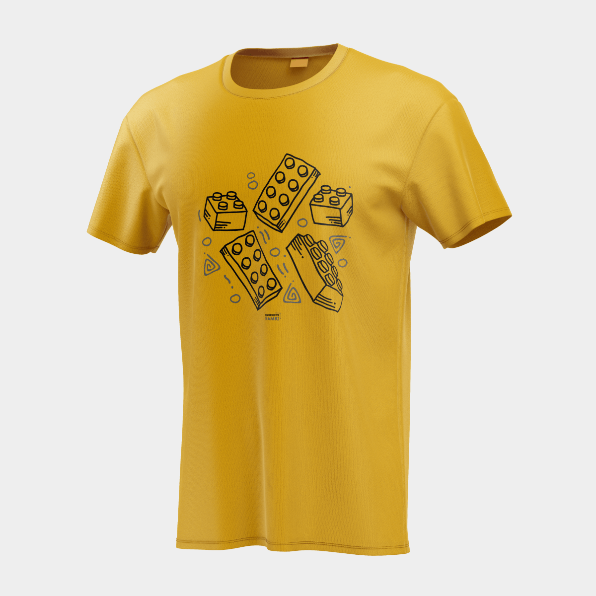 Koszulka w kolorze Gold (złoty / żółty) przyciąga wzrok dzięki wyjątkowemu nadrukowi – czarne, imitujące odręcznie rysowane klocki LEGO, otoczone szarymi akcentami, nadają jej dynamiczny, nowoczesny charakter. To świetny wybór dla tych, którzy uwielbiają łączyć pasję do budowania z oryginalnym designem.