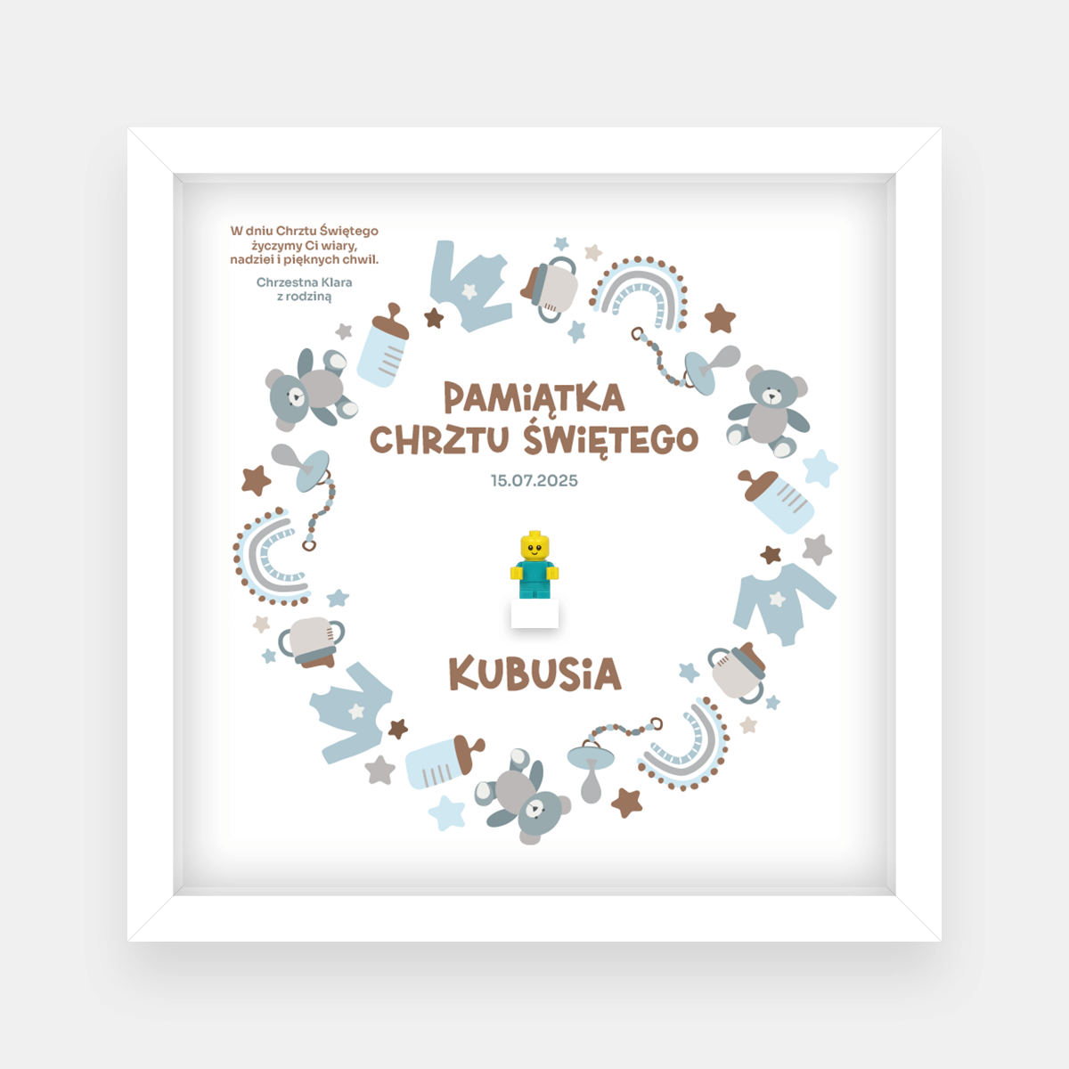 Ozdobna ramka z nadrukiem okrągłej dekoracji w odcieniach niebieskiego i brązu to klasyczna i elegancka propozycja dla chłopca z okazji Chrztu Świętego. Centralnie umieszczona figurka bobasa z klocków LEGO oraz możliwość personalizacji czynią z niej piękną pamiątkę na całe życie.