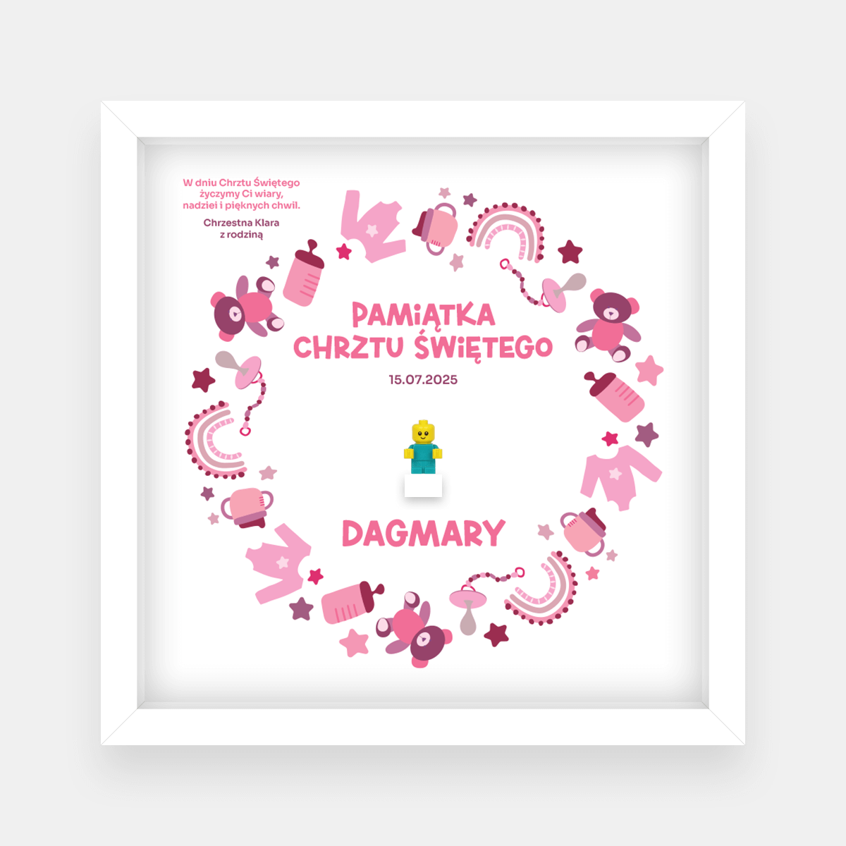 Różowa wersja ozdobnej ramki została zaprojektowana z myślą o pamiątce Chrztu Świętego dziewczynki – delikatna, a zarazem wyrazista. W środku znajduje się figurka bobasa z klocków LEGO, a personalizowany napis w tle dopełnia całości. Pamiątka, która zostanie z Wami na zawsze.