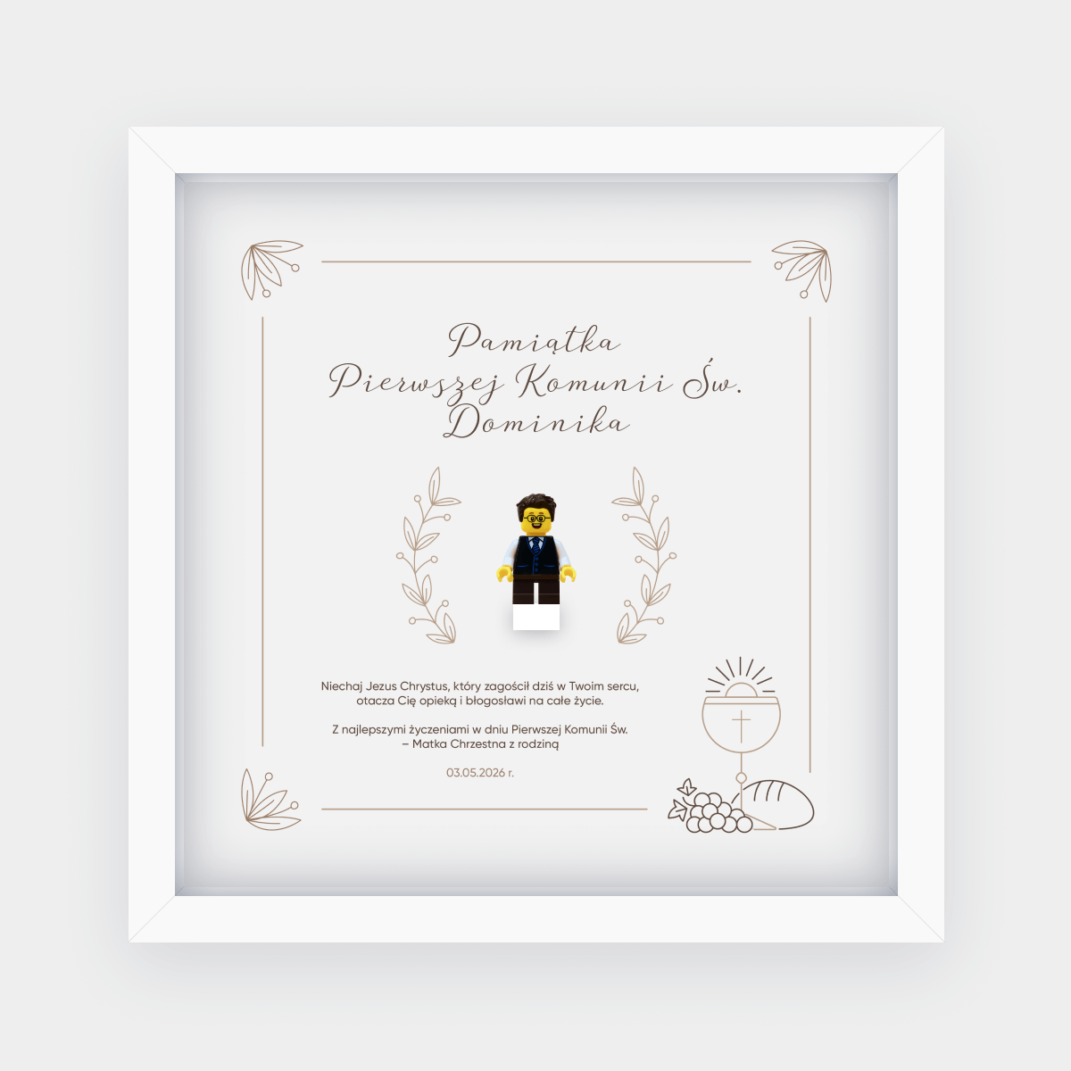 „Piaskowy Minimalizm” to ramka oparta na prostocie i harmonii. Subtelna, jasna kolorystyka oraz delikatne, piaskowe linie tworzą spokojną kompozycję, która podkreśla duchowy charakter uroczystości. Cienka, geometryczna linia porządkuje przestrzeń, a symboliczne elementy – kielich, winogrona i chleb – nawiązują bezpośrednio do istoty sakramentu. Całość jest stonowana, wyważona i ponadczasowa.