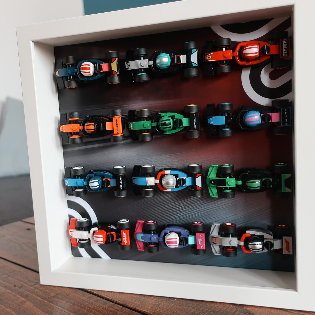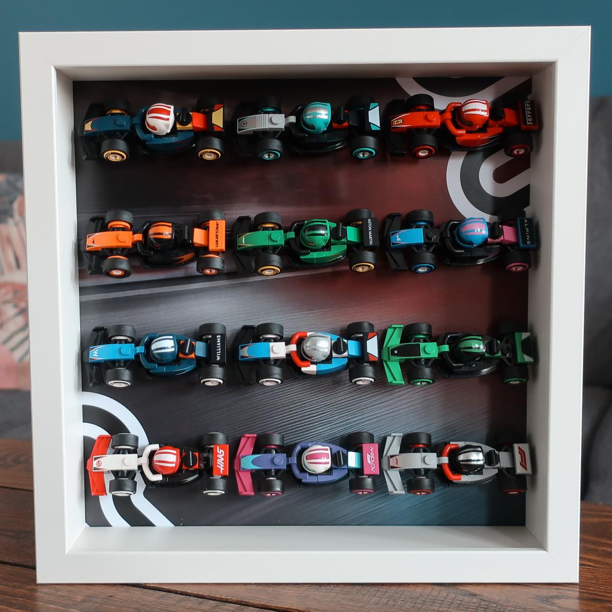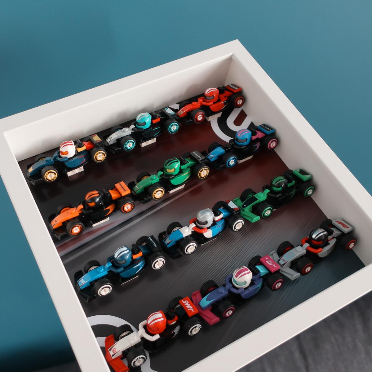 Ramka przeznaczona do bolidów z serii Lego 71049 F1 Collectible Race Cars. Mieści 12 bolidów z kolekcji. W tle znajduje się motyw graficzny inspirowany opakowaniem zestawu, dzięki czemu całość prezentuje się wyjątkowo spójnie.