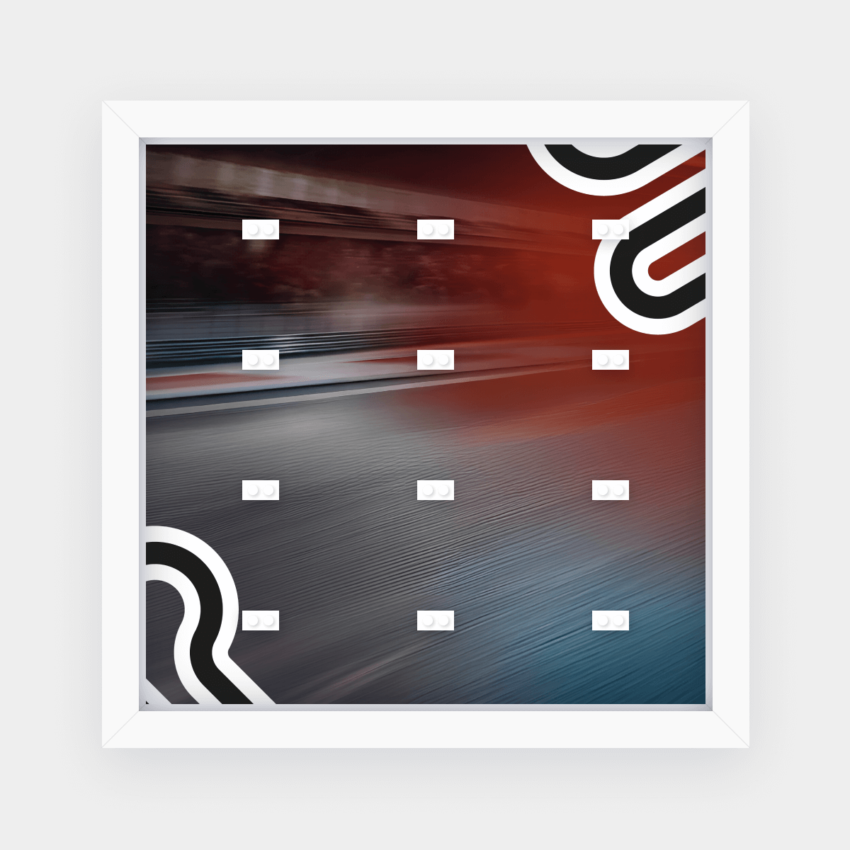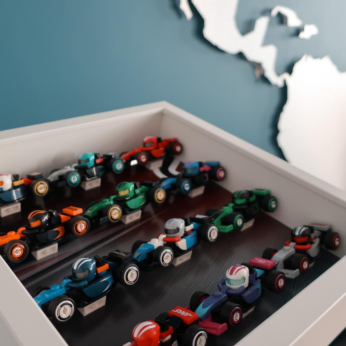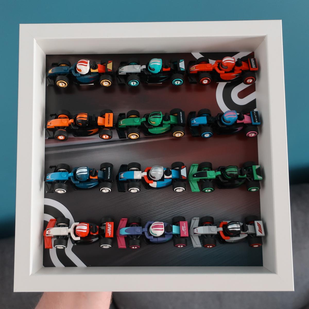 Ramka przeznaczona do bolidów z serii Lego 71049 F1 Collectible Race Cars. Mieści 12 bolidów z kolekcji. W tle znajduje się motyw graficzny inspirowany opakowaniem zestawu, dzięki czemu całość prezentuje się wyjątkowo spójnie.