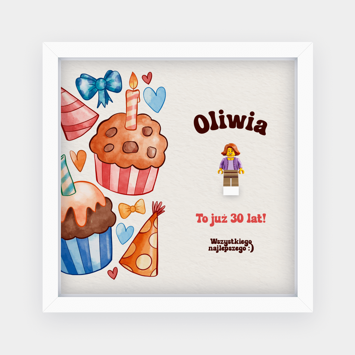 Ramka zawiera minifigurkę. Wygląd figurki można dostosować do wizerunku obdarowywanej osoby. Skorzystaj z naszego Konfiguratora minifigurek albo prześlij nam zdjęcie lub opis wyglądu osób, a my na tej podstawie zaproponujemy figurkę.