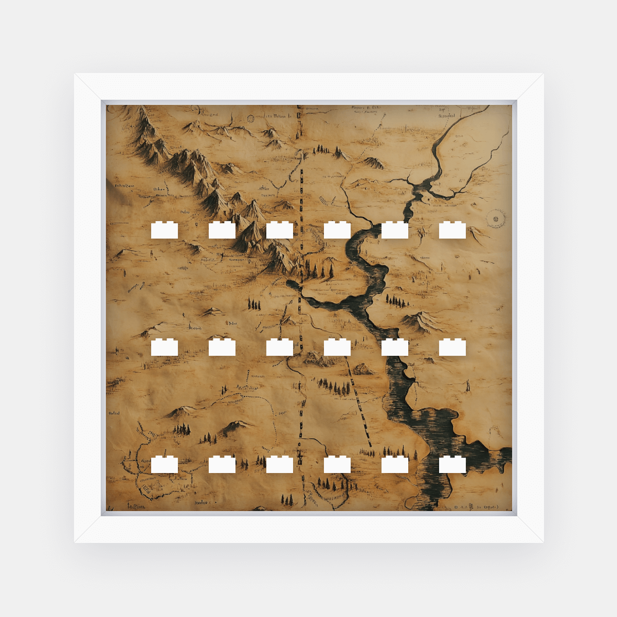 Nie każda kolekcja musi stać w równych szeregach – czasem lepiej, gdy wygląda jak ekipa wyruszająca na wielką przygodę. „Mapa wyprawy” to tło, które zamieni Twoje minifigurki z klocków LEGO w bohaterów pełnych odwagi, gotowych odkrywać nowe lądy i sekrety. Ramka pomieści 18 figurek, dając im wspólną bazę wypadową.