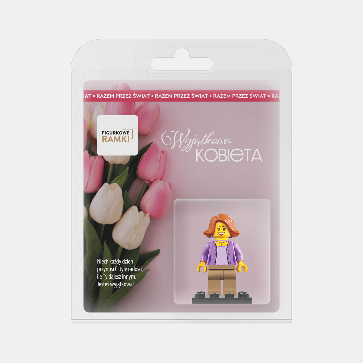 - Figurka umieszczona w blistrze z kobiecym motywem – pastelowe tło i tulipany
